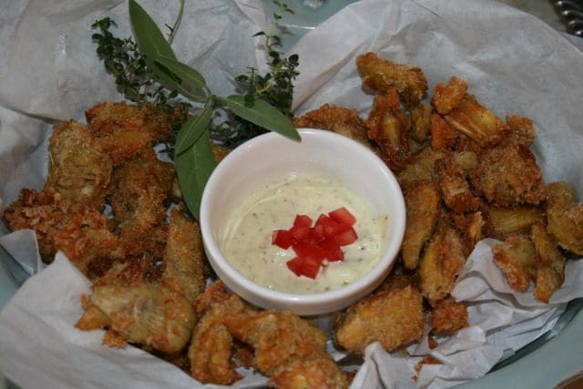 Tip – You can buy quartered artichokes. Also, toss a few breadcrumbs into the saute pan to see if it’s ready to fry.
